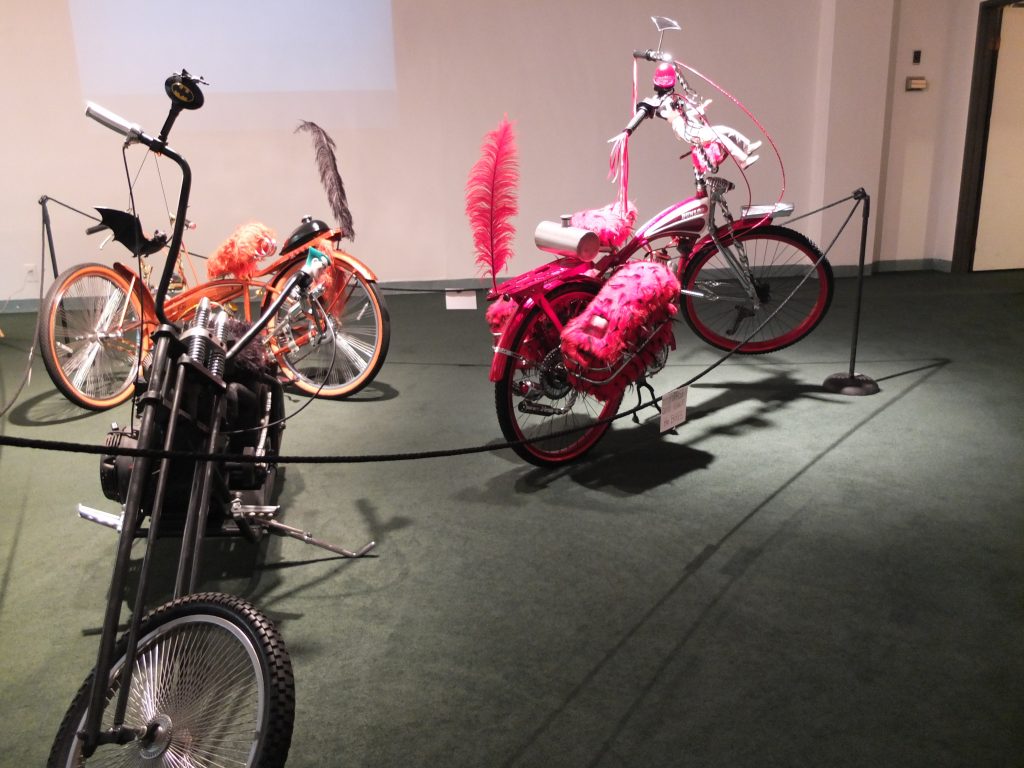 Perhaps playing on traditional gallery aesthetics, the outrageous bikes, bursting with feathers, faux fur and throbbing colour were exhibited behind ropes. Their character reminded me of dragons, powerful and vivid against the original, dark green shopping centre carpet. And with the blaring hum of busy Downtown in the background, it felt like the bikes could at any minute start up on their own and ride straight out of the building onto bustling Broadway St.
