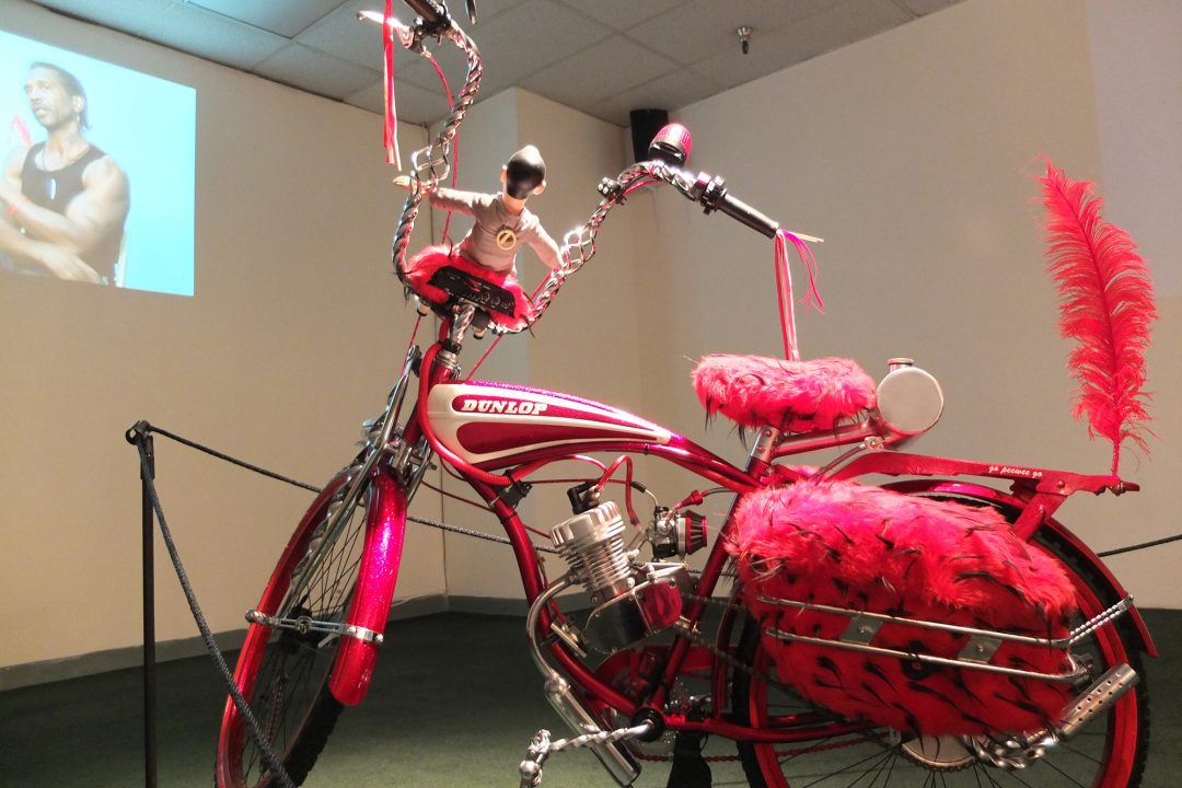 The exhibition, Screaming Two Wheelers, included three bikes that were hand crafted by Dogan as symbols to create “positive disruption” against the “oppressive forces” that L.A.’s homeless face. Dogan, a longstanding Skid Row inhabitant and community “champion” initially aimed for the bikes to attract attention as he rode through the streets, “working with residents to foster cultural resistance in the face of aggressive policing strategies in a city where he continually witnessed and experienced the criminalization of homelessness.”
